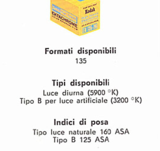 La pellicola Kodachrome, ossia la più famosa pellicola positiva a colori in ambito professionale nel periodo dal 1940 al 1970 - in sostanza lo standard editoriale per le immagini a colori - aveva all'inizi una sensibilità dai 10 ai 16 Asa. Poi aumentò a 25 Asa, e successivamente a 64. Lo sviluppo avveniva solamente in laboratori specializzati ed era necessario spedirla per posta. L'Ektachrome, prodotta sempre dalla Kodak, si poteva sviluppare anche a casa ed era considerata più rapida, ma aveva comunque una sensibilità di 32 Asa (ne esisteva tuttavia una versione "high speed" da 160 Asa). La Kodakolor, pellicola negativa a colori, aveva anche essa una sensibilità di 32 Asa.